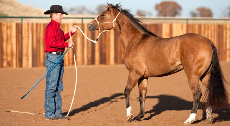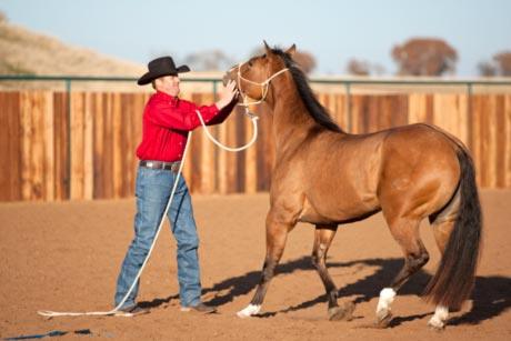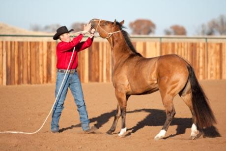 Another tactic is to make the horse think that he’s punishing himself. For example, a lot of young horses like weanlings or yearlings get mouthy. They’ll come up to you and start nibbling on the sleeve of your shirt or your jeans. If your horse walks up to you and starts playing with your sleeve, without even looking at him, flap your elbow out to the side so that he runs into it with his nose and feels uncomfortable. You have to time it just right so that at the same time he leans forward to play with your shirt, he runs into your elbow. The secret is not to look at him or act like you’re moving your arm on purpose. It’s like your elbow just developed a nervous twitch. If you look at the horse, it’s like you’re acknowledging that you’re the one making him feel uncomfortable. You want the horse to think that he’s doing it to himself. Every time he leans in to nibble on you, he runs into your elbow. Horses always learn faster when they teach themselves the lesson. It wont be long before your horse is like “Man, I really need to keep my lips to myself because I seem to be running into his elbow.”