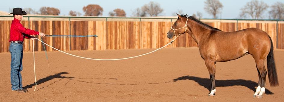 Then bait him again by waving the end of the stick around the end of his nose. In most cases, the horse will grab it again, and when he does you’ll repeat the same steps. It usually takes three times for a horse to actually start to understand the lesson. By the third or fourth time, your horse will not want to grab a hold of that stick because every time he grabs a hold of it, you make him feel uncomfortable. You’re saying to the horse, “Hey, if you want to chew the stick, you can chew it, but you’re going to feel uncomfortable.”
