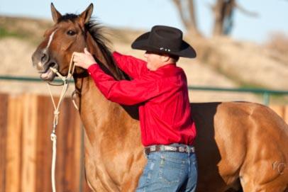 Let’s say that your horse grabs the halter in his mouth as you go to put it on. As soon as he grabs it, instead of trying to pull it out of his mouth, stand beside him and tug one end of the halter up in his mouth and then the other end to make him feel uncomfortable. When you do that, the horse might throw his head up in the air, but you’ll continue to tug up on the halter. You’re not really hurting him, but you are making him feel uncomfortable. Do that for ten seconds and then let the horse lower his head and spit the halter out of his mouth. Then dare him again by waving the halter in front of his nose. If he grabs it, repeat the process. You’ll only have to do that two or three times, and pretty soon, those horses wise up and want no part of grabbing a hold of the halter.