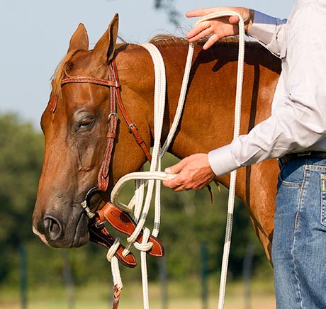 For either option, the slack in the rope should hang down slightly lower than the loop rein, hanging 2 to 3 inches below it. Reason being that you don’t want the lead to hinder the horse’s head if you are flexing to the right when mounted. If the lead is too short, your horse can’t flex far enough because he’ll run into pressure.