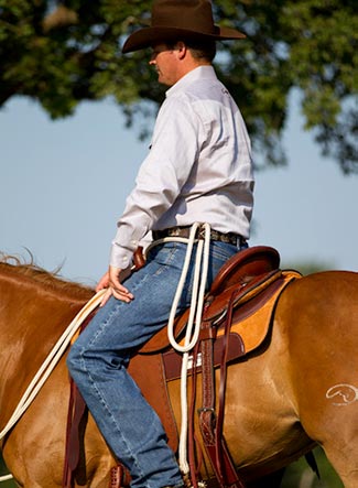 To use the second option, bring the lead rope around the right side of the pommel of the saddle, then up to your left hip. Make a loop and push it up between your belt and jeans, from the bottom, so that the loop hangs over the top. Always put it past the second keeper of your jeans to keep it from falling out. It will stay in place while riding, but will come out easily if pressure is applied, making it a safe option.