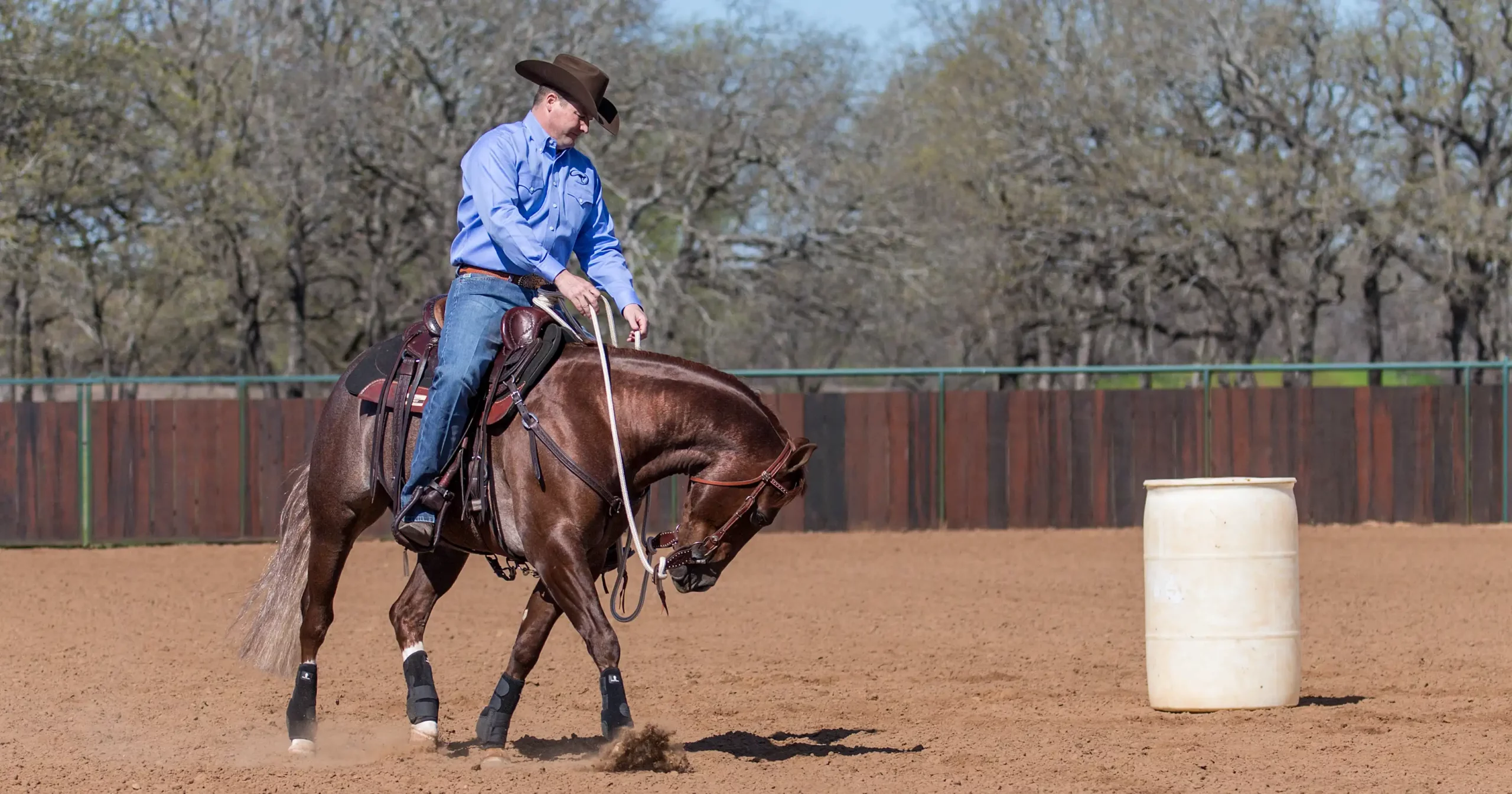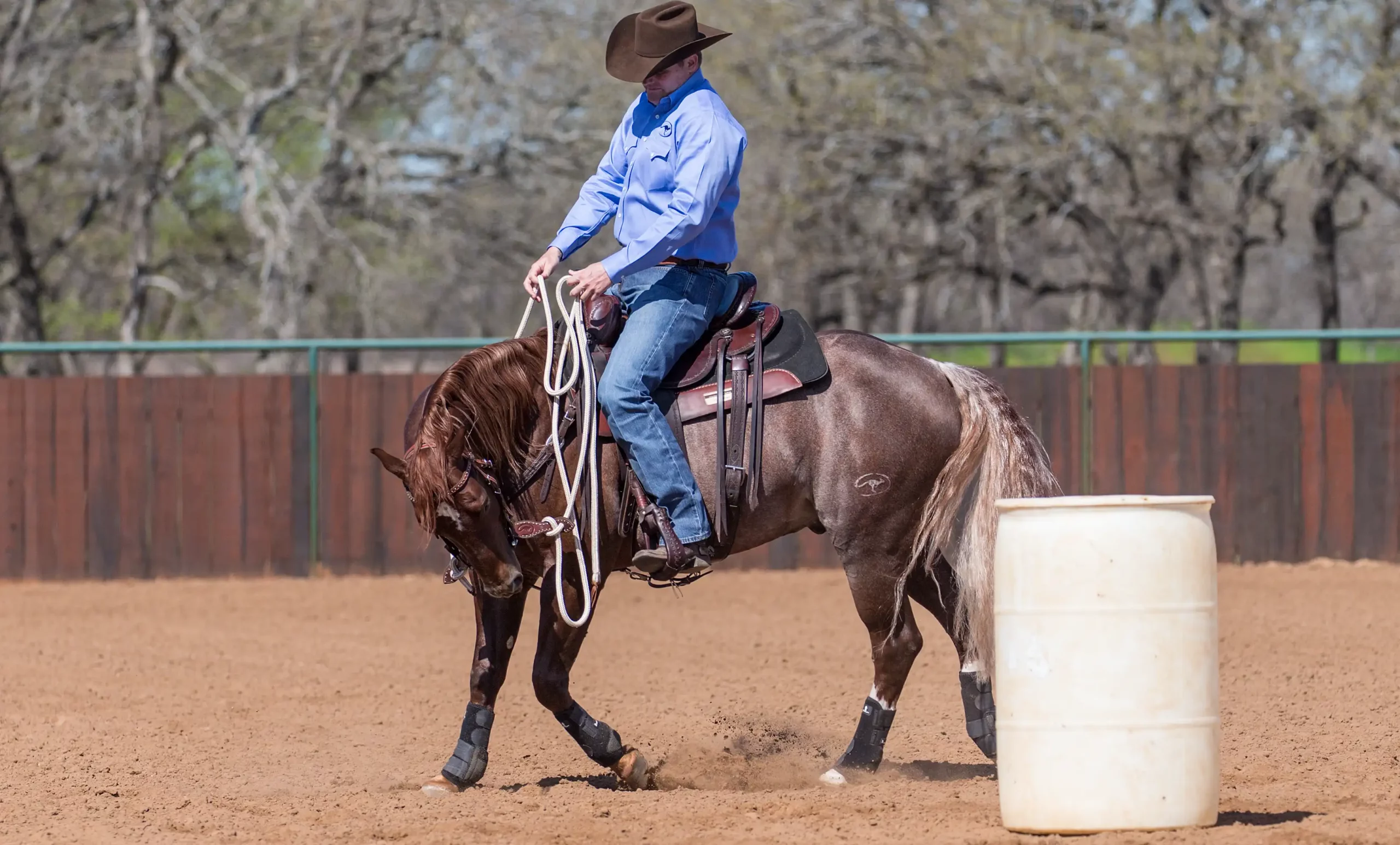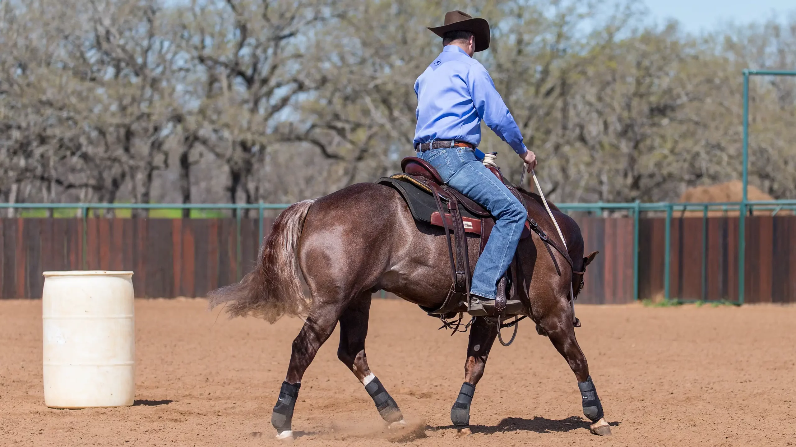As soon as he comes out of the rollback, take him straight back into a counterbend and circle the barrel going in the opposite of the direction you were initially going in. In this photo, now that I’ve changed directions, my right rein is my direct rein, my left rein is my indirect rein and I’m using my right leg to move Jackson’s shoulders around in the circle.