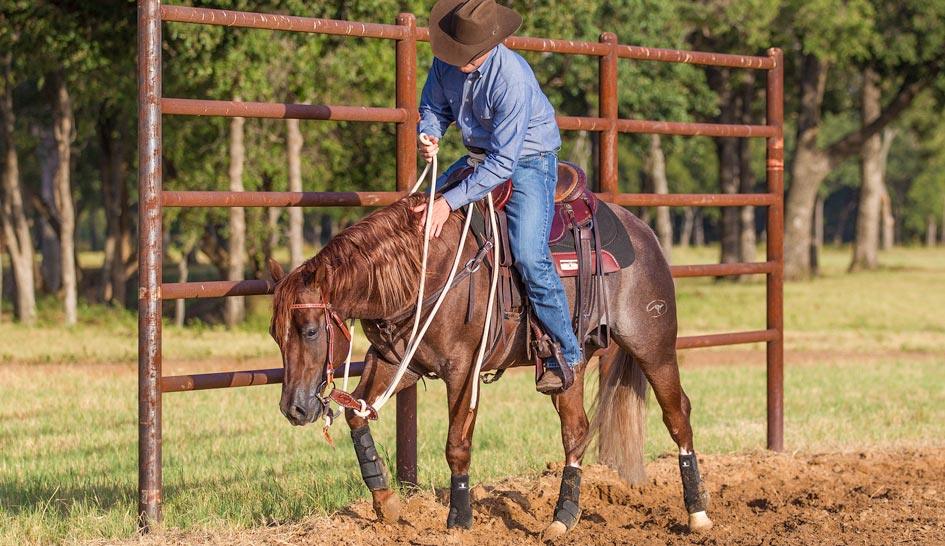 All over the ranch, I’ve constructed “rollback fences.” These are 6-foot high gate panels set in front of a 45-foot dirt circle. The purpose of the fences is to be able to train on horses while riding them on the trail. Instead of just doing rollbacks in the middle of a dirt road, these fences make it easier to direct a young or green horse through the maneuver. While you might not have such a training tool at your disposal, you can implement the same training plan I describe by incorporating natural obstacles.