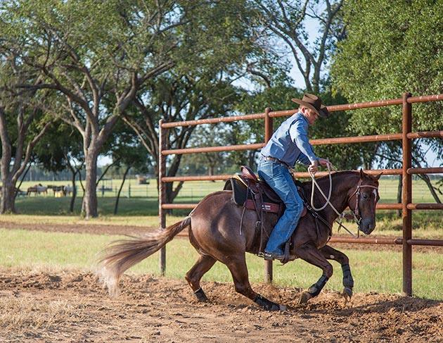 After you’ve let the horse walk for about five minutes, put his feet to work again. The rollback fences on the ranch are roughly a half mile apart, which is the perfect distance to let the horse relax and get his air back before hustling his feet again.