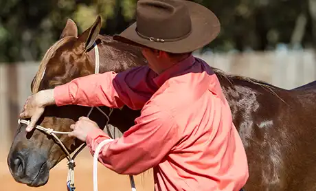 Always rub the horse with a lot of feel to your hand. Rubbing is a soothing sensation that will relax and comfort him. Patting doesn’t feel comfortable to the horse and will make him want to get away from you.