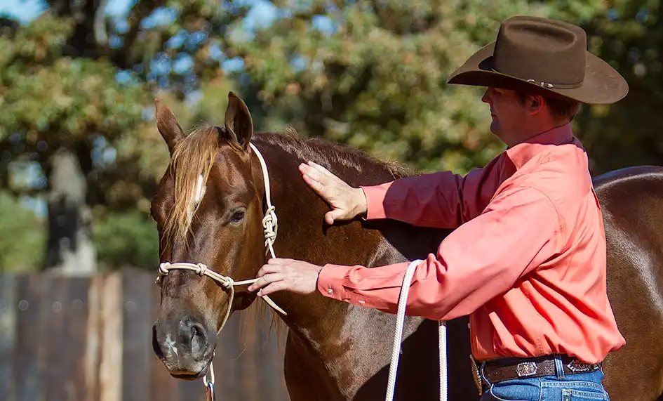 You’ll get your horse over his fear by desensitizing him to your hands touching his ears using the Approach and Retreat Method. You’ll start by rubbing your horse’s body in an area he’s comfortable with and then gradually working your way to his ears. By approaching him and then retreating when he stands still and shows a sign of relaxing, you’ll build his confidence. When a horse relaxes, he’ll do one of five things: he’ll lick his lips, lower his head, blink his eyes, cock a hind leg or take a big breath. When he stands still and shows one of these signs of relaxing, you’ll retreat and go back to rubbing him in a spot he’s comfortable with, such as his neck or withers. Sometimes a horse won’t show you any of these signs, but as long as he stands still for 15 seconds, you can take away the pressure. If a horse stands still for 15 seconds, he’s telling you that he’s not interested in running. He may still be a little frightened, but he’s starting to use the thinking side of his brain and has chosen to stand still.