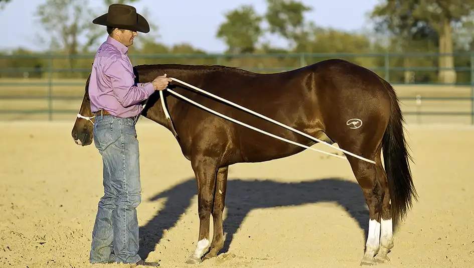 I began by desensitizing Blue’s legs to the lead rope by seesawing the rope back and forth and up and down his hind leg. I started up high on his leg because the lower down the leg you go, the more sensitive the horse is. Anytime Blue moved or kicked out at the rope, I just kept his head tipped toward me and seesawed the rope like nothing happened. As soon as he stopped kicking, stood still and relaxed, I stopped seesawing the rope and rubbed his face.