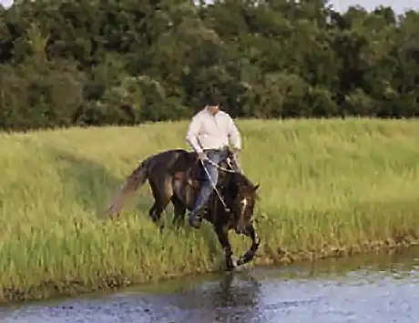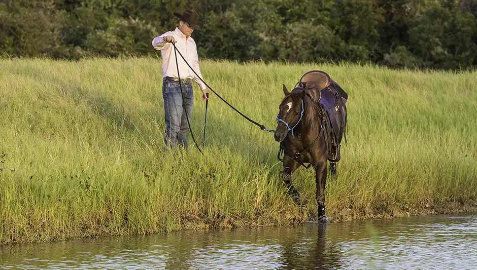 When approaching a large body of water, trot the horse in a straight line along its bank. Then ask the horse to stop and turn in toward the water and trot off in the new direction. Each time you turn the horse into the water, he’ll get closer to it until he eventually steps in it. If you’re consistent, the horse will confidently walk through the water.