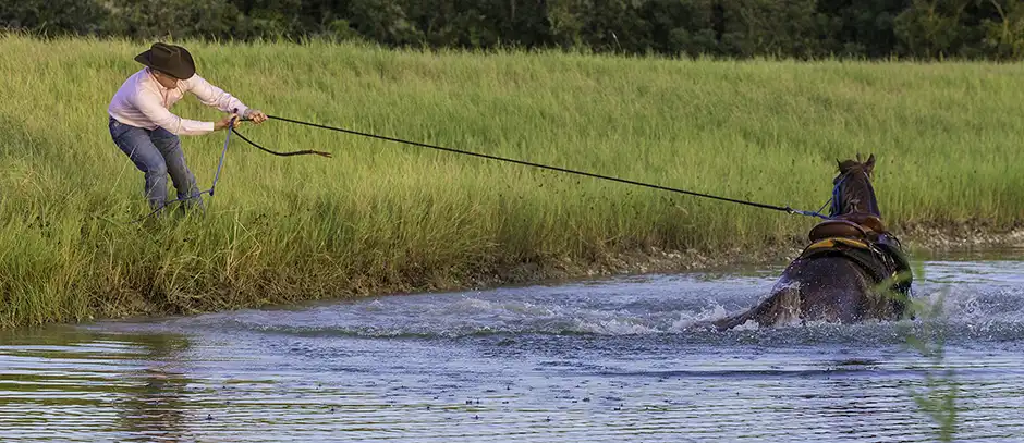 We teach our horses to crave water at the ranch by letting them rest in a pond at the end of training sessions.