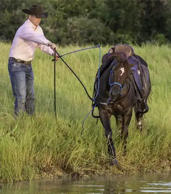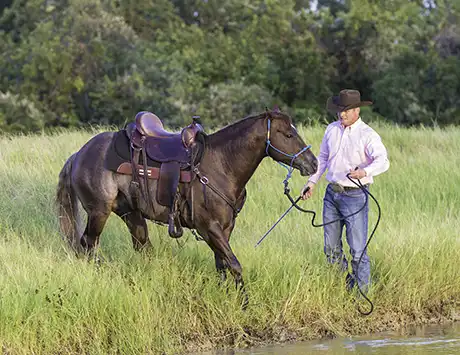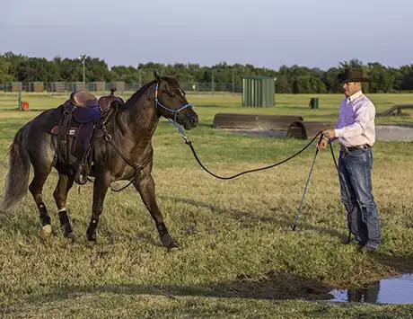 With that being said, there are some horses out there that’ll get smart and realize that if they act scared of the water, they’ll get to rest at the edge of it all day long. They’re not really scared of the water; they’re just lazy. So with these horses, you need to add a little bit of pressure and encouragement to make them step into the water. When the horse is confident about walking through a puddle of water, move on to a bigger challenge. You may go from a puddle to a small stream to a pond and so on. No matter the size of the body of water you’re asking the horse to cross, the same training principles apply. You’ll begin by sending the horse between you and the water and then ask him to step in it. If you can’t get control of the horse’s feet near the water, you will never be able to control them in the water. Rather than doing the Sending Exercise into and out of the water, when you start working with a large body of water like a pond, you can use Lunging for Respect Stage Two to keep the horse’s feet moving in and around the obstacle. When working with a larger body of water, most horses will get their feet wet and then jump out. Be ready for this. Keep your Handy Stick in front of you and be aware of what the horse is doing so you don’t get jumped on. Continue asking the horse to step into the water until he no longer gets uptight about getting his feet wet.