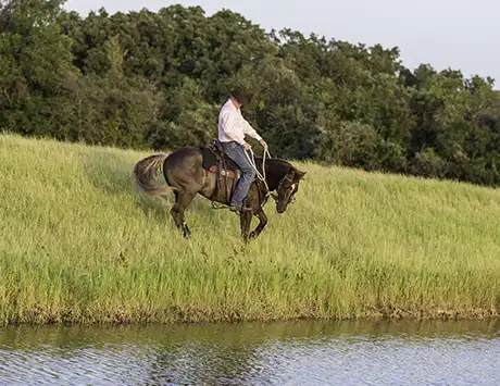 Be aware that some horses will try to run into large bodies of water. If your horse does that, don’t get dragged in behind him!