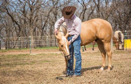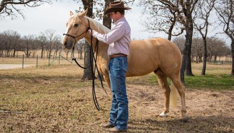 I teach all of my horses to lower their heads using the Intermediate groundwork exercise Touch and Rub: Poll. When the horse’s head is level with your belt, reach your right arm over his head and apply pressure to the right side of his face with your fingertips. As soon as he yields to the pressure by tipping his nose toward you, rub him in the same place you pressed. In the beginning, you can help him understand by pulling on the halter, or if the halter isn’t on, using the tail of the halter to apply pressure. If you practice doing this every time you halter and unhalter your horse, you will develop a positive habit. It won’t be long before the horse lowers his head and bends it toward you before you even ask him to.