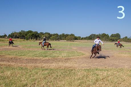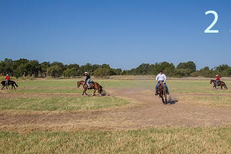 1. In this exercise, a group of riders will lope their horses in a cloverleaf pattern, with each rider doing his own separate pattern so traffic is going in both directions. In order for the exercise to have the most effect on the horses, you need at least three horse-and-rider combinations participating.