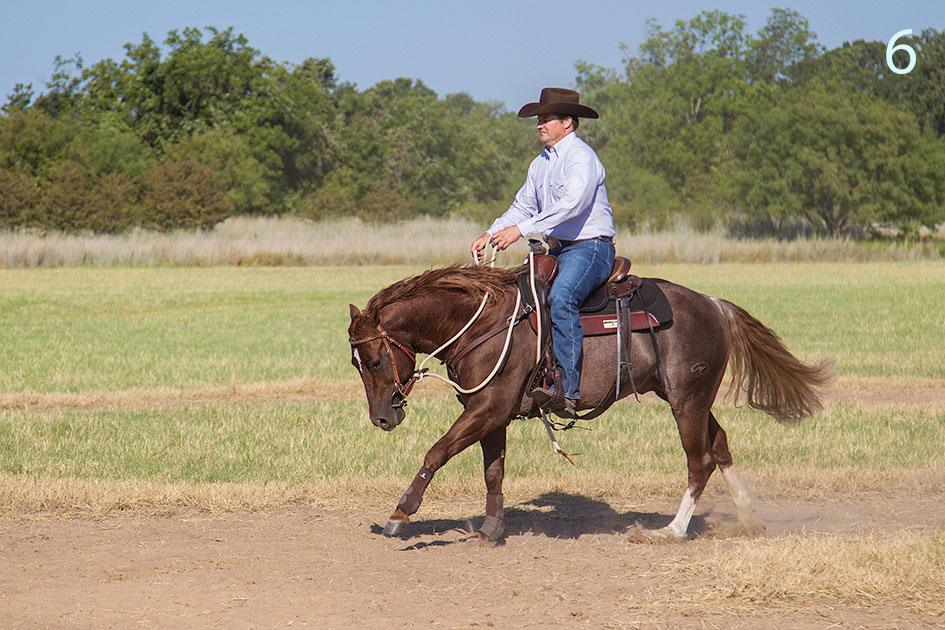4. Ride the horse on a loose rein and dare him to lean in a particular direction or dart off on the pattern. If the horse doesn’t lean, then turn him in the same direction as the lead he is on. So if he’s loping on the left lead, turn him left.