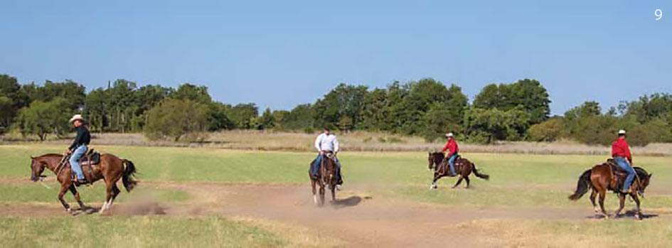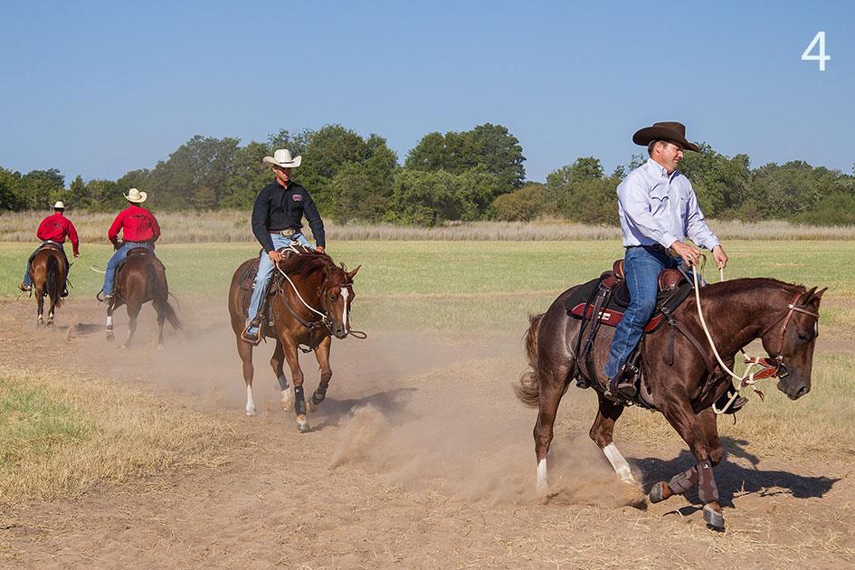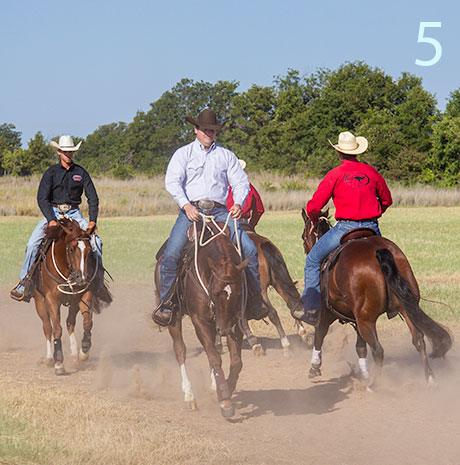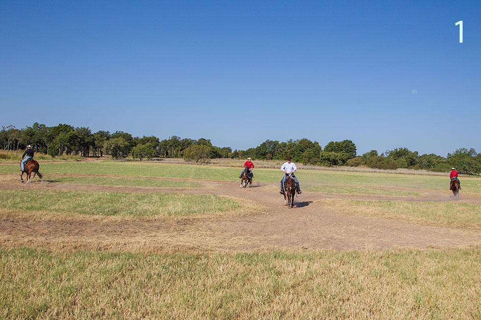2 & 3. Although you’re riding in a group, you’ll direct your horse around the pattern, depending on what he needs. Anytime you feel him leaning in a certain direction or anticipating a turn, you’ll turn him in the opposite direction. So if you feel him leaning right, you’ll turn him left. In that way, this exercise is very much like Confused Loping, one of the first exercises you taught the horse outside.