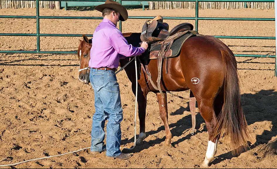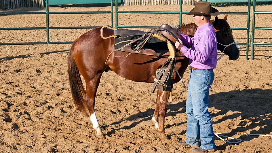 The key to successfully saddling a colt for the first time is to get his feet moving and to let him get comfortable wearing the saddle.