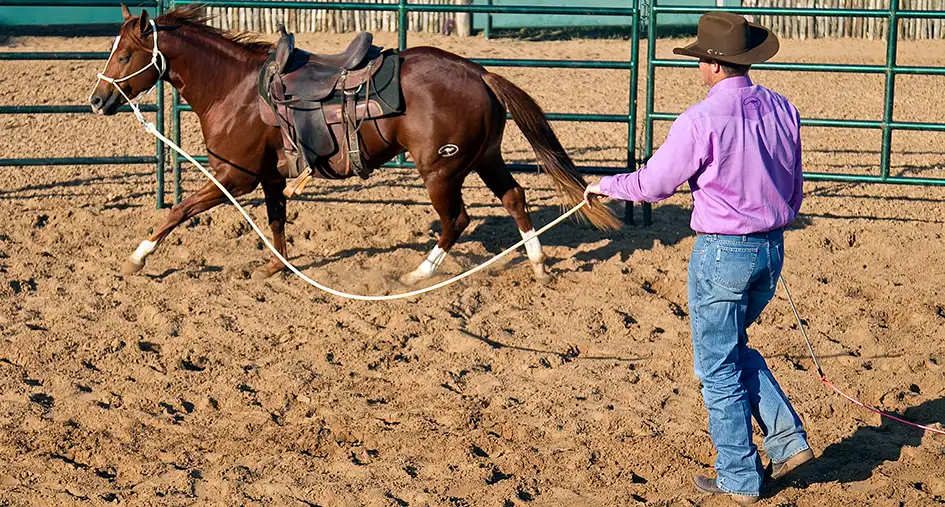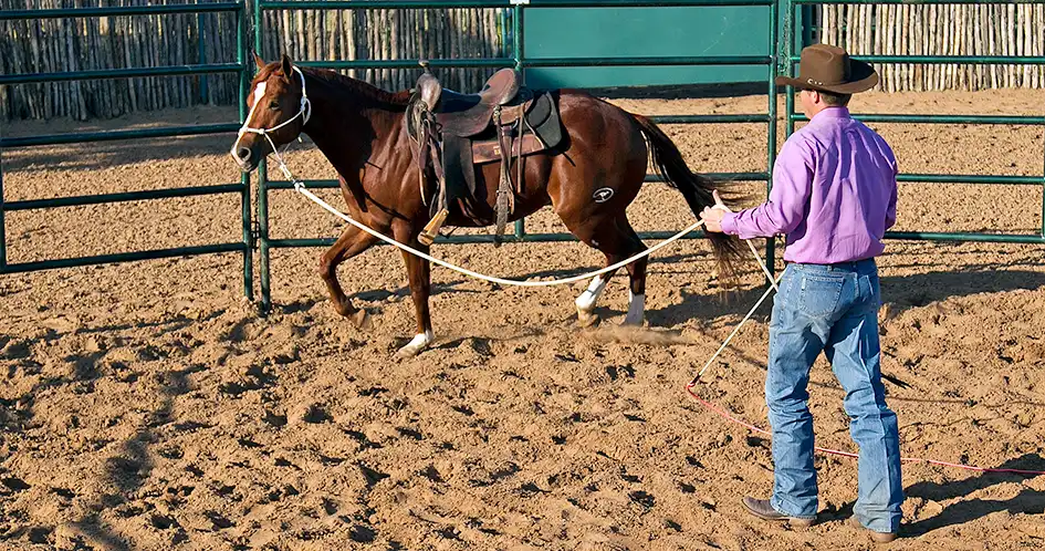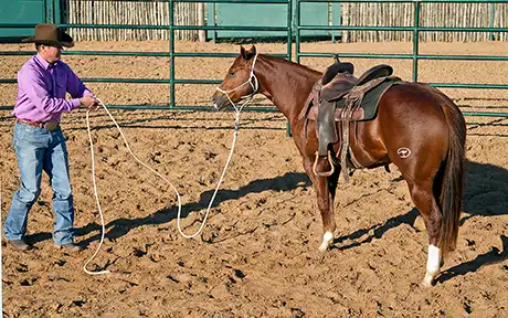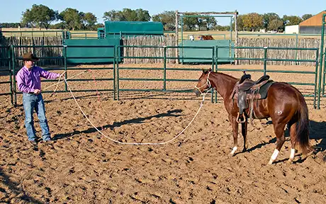It’s very important to get the colt cantering. When he canters, the stirrups will bump against his sides, the saddle will move on his back, and the cinches will pull on him in different ways than at the trot. Some colts will be fine at the trot, but as soon as you ask them to canter, they’ll start bucking. Don’t worry about trying to make the colt lunge a perfect circle; just hold the end of the lead rope and let him follow the outside of the roundpen. Run a little bit yourself if you have to in order to give him enough room to canter.