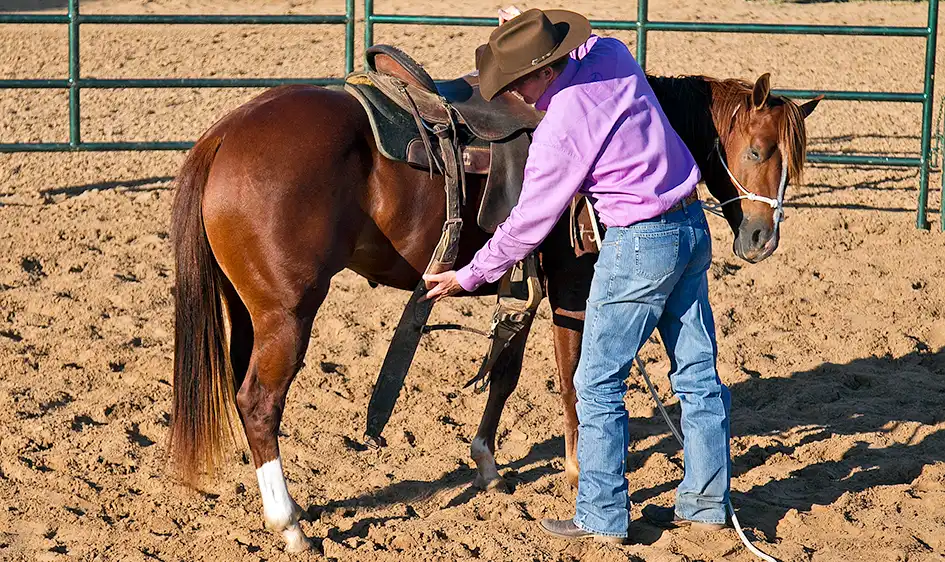 When done up correctly, the back cinch should be just touching the colt’s belly. A lot of people leave the back cinch so loose that there’s a 2- or 3-inch gap between it and the horse’s belly. That’s a good way to get bucked off or to get into a wreck if the horse kicks at a fly and gets his foot caught in the cinch. If you don’t do the cinch up so that it’s touching the colt’s belly, what’s likely to happen is he won’t feel the cinch underneath him and then when you ask him to canter or change directions, all of a sudden the cinch will touch him and he’ll take off bucking because he’s surprised by it. Stay safe by always doing the back cinch up correctly.