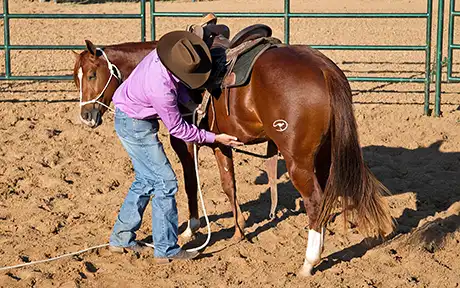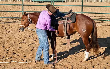 17 When the colt is moving around the circle relaxed, yield his hindquarters to bring him to a stop and tighten the front cinch up for the third and final time.
