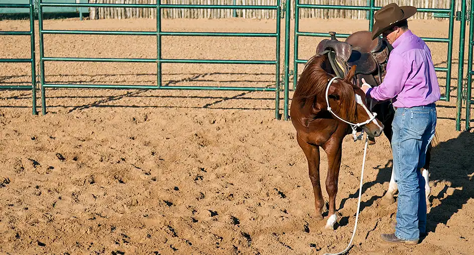 The worst thing you can do is saddle a colt up and then take the saddle straight off. You never want to take the saddle off until he is absolutely convinced that he can’t get rid of it and that it’s not going to harm him. If you come back after eight hours and he’s still snorting and bucking with the saddle, leave it on him all night. Put some hay and water out in the arena and leave him alone. If he’s really frightened of the saddle, you may have to keep it on him for two days. Do what you have to do to get the job done. The secret is to not take the saddle off until the colt is ignoring it.
