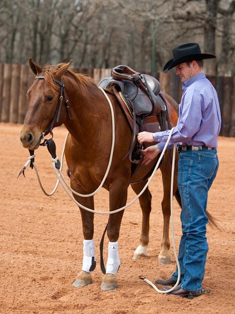 While, there’s no golden rule for how tight you should cinch your horse, remember that you should tighten it in stages. The first time, I cinch the horse snugly but I don’t cut him in half. I want to give him a chance to warm up and get comfortable before I really cinch him up. I’ll do groundwork for about five minutes, and then I’ll check the girth and tighten it a little more. I’ll do groundwork again for five to 10 more minutes, and then I’ll tighten my girth for the third time.