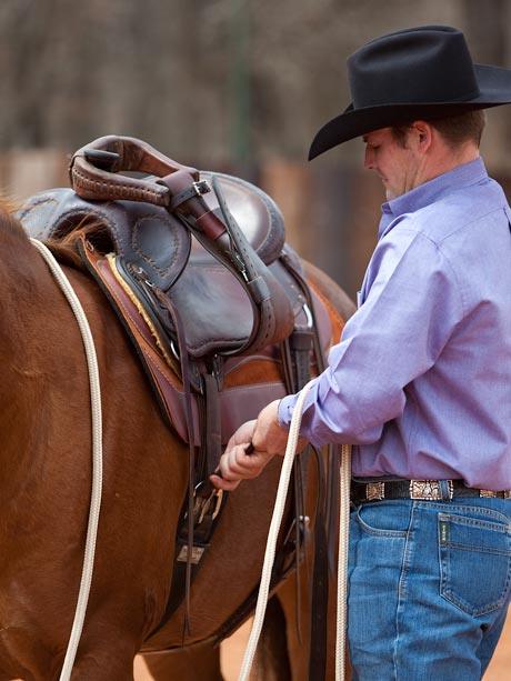 When my horse is warmed up and mentally ready, I’m not afraid to cinch him up tight. The reality is most people don’t tighten their horse’s cinch up nearly enough. This isn’t just careless — it’s dangerous. When a saddle slips under a horse’s belly, whoever’s riding him is going to end up in a massive wreck.