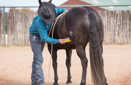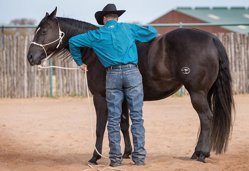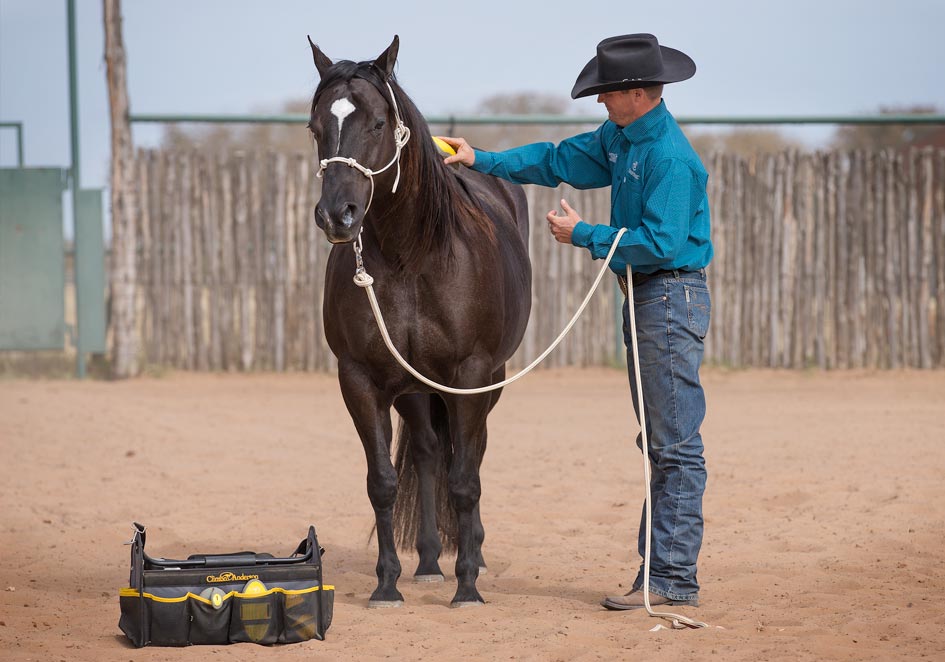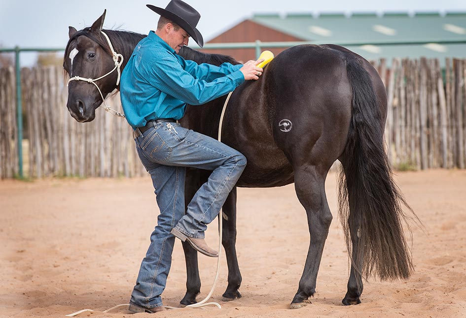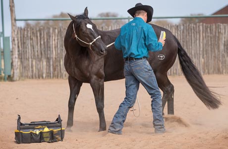 After you’ve thoroughly desensitized your horse to the lead rope and stick and string, you’ll use the Approach and Retreat Method to desensitize him to your hands touching his body and then your grooming tools. By approaching him and then retreating when he stands still and shows a sign of relaxing, you’ll build his confidence. When a horse relaxes, he’ll do one of five things: he’ll lick his lips, lower his head, blink his eyes, cock a hind leg or take a big breath. When he stands still and shows one of these signs of relaxing, you’ll retreat and stop rubbing him in the sensitive area. Sometimes a horse won’t show you any of those signs, but as long as he stands still for 15 seconds, you can take away the pressure. If a horse stands still for 15 seconds, he’s telling you that he’s not interested in running. He may still be a little frightened, but he’s starting to use the thinking side of his brain and has chosen to stand still.